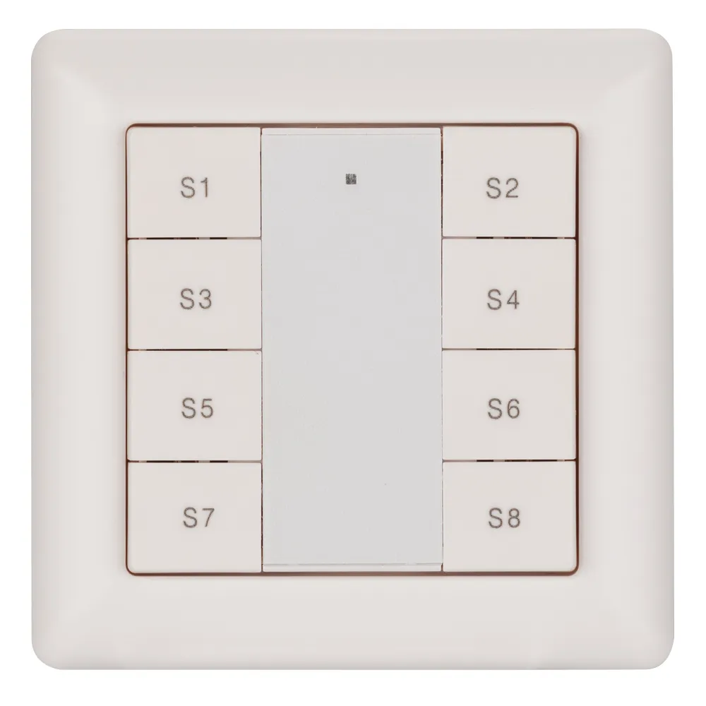 Встраиваемая кнопочная белая пластиковая панель для работы по протоколу DALI. Может устанавливаться как в дополнение к диммирующей панели, так и автономно, для вызова ранее сохраненных сцен в 1 группе управления. Установка номера группы выполняется переключателями на корпусе. 8 кнопок, 8 сцен (вызов). Установка номера первой сцены выполняется переключателями на корпусе. Питание от шины DALI (4 мА). Стандартная рамка входит в комплект поставки.