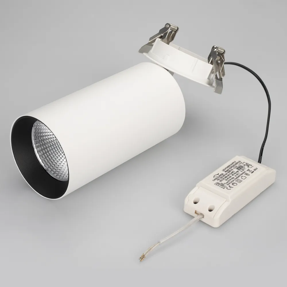 Цвет свечения ТЕПЛЫЙ БЕЛЫЙ 3000K, св.поток 2530лм, CRI(Ra)>80, угол 40°. Размер DxH Ø100x220мм, отверстие для установки Ø90мм. Встроенный драйвер PRI:220-240VAC, SEC:DC 600mA 30-43V 25Вт.