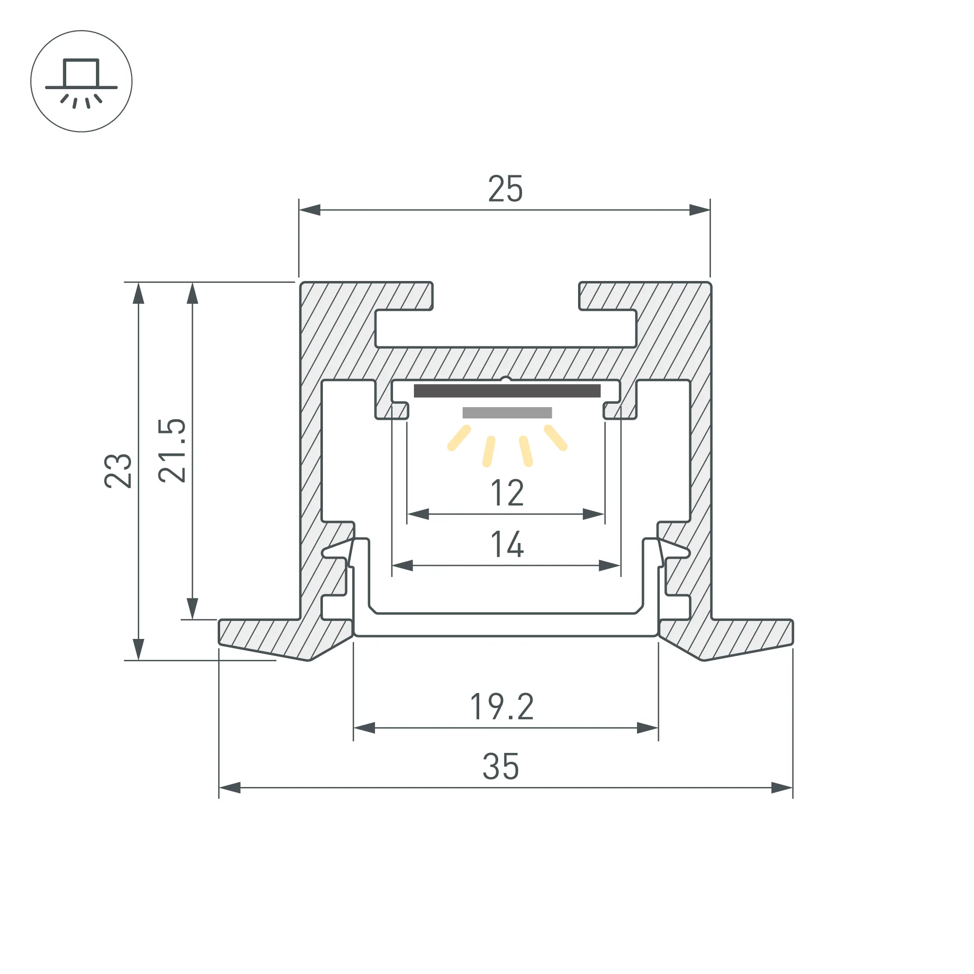 Алюминиевый профиль для светодиодных лент и линеек. Цвет - черный RAL9005 (порошковая окраска). Габаритные размеры (L×W×H): 2500x35,6x23,2 мм, паз для установки 25 мм. Ширина площадки для ленты 12 мм. Экраны, заглушки и другие аксессуары приобретаются отдельно. Цена за 1 метр.