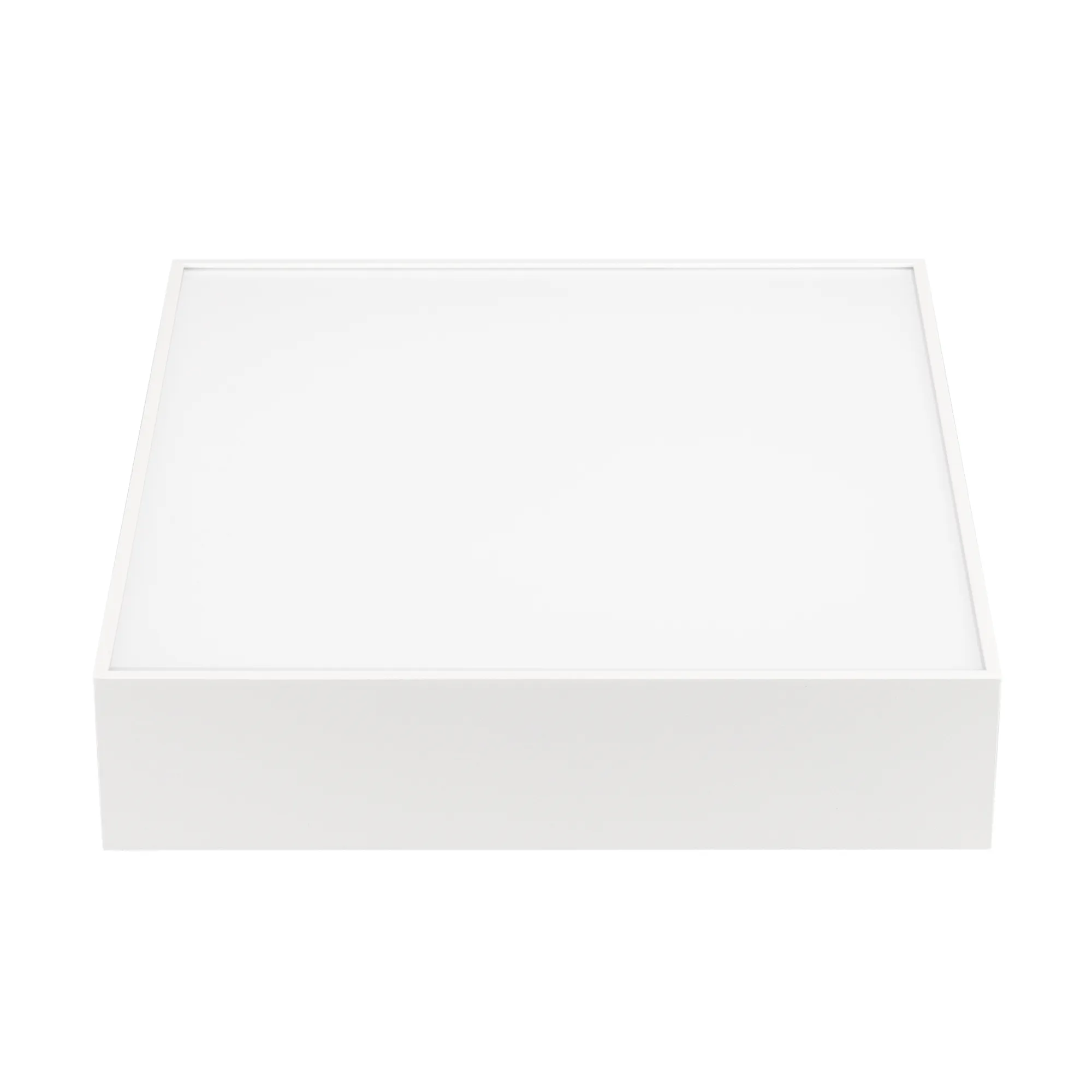 Накладной светильник. Мощность 25 Вт, св. поток 1440-1900 лм, 76 лм/Вт, теплый 3000 K, CRI>90, угол 120°, напряжение питания 230 В. Белый квадратный корпус из алюминия, экран PC, степень защиты IP40. Размер: длина 250 мм, ширина 250 мм, высота 59 мм. Монтаж накладной. Драйвер 27-45 В, 600 мА, пульсация <5%.