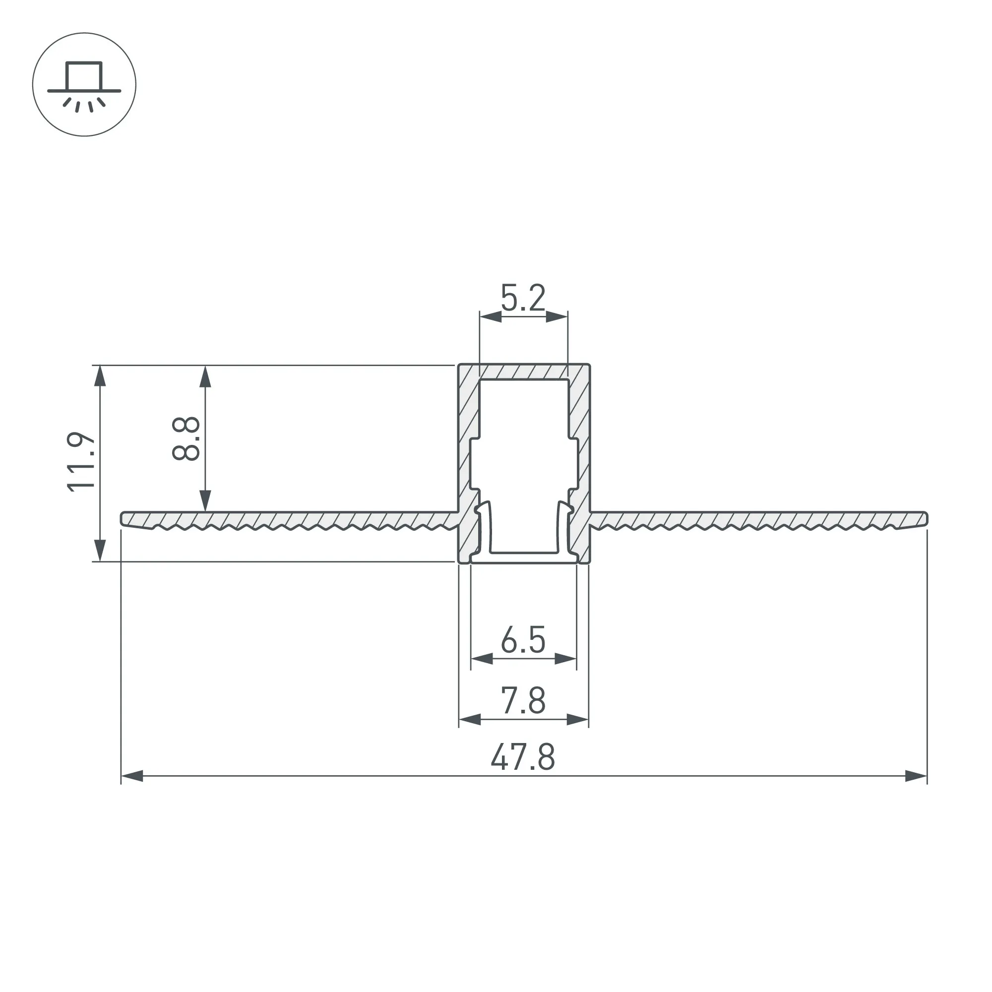 Алюминиевый анодированный профиль для светодиодных лент и линеек. Скрытая установка (под строительную отделку). Габаритные размеры (L×W×H): 2000x47,8x12 мм, паз для установки 8х8,8 мм. Ширина площадки для ленты 5,2 мм. Экраны, заглушки и другие аксессуары приобретаются отдельно. Цена за 1 метр.