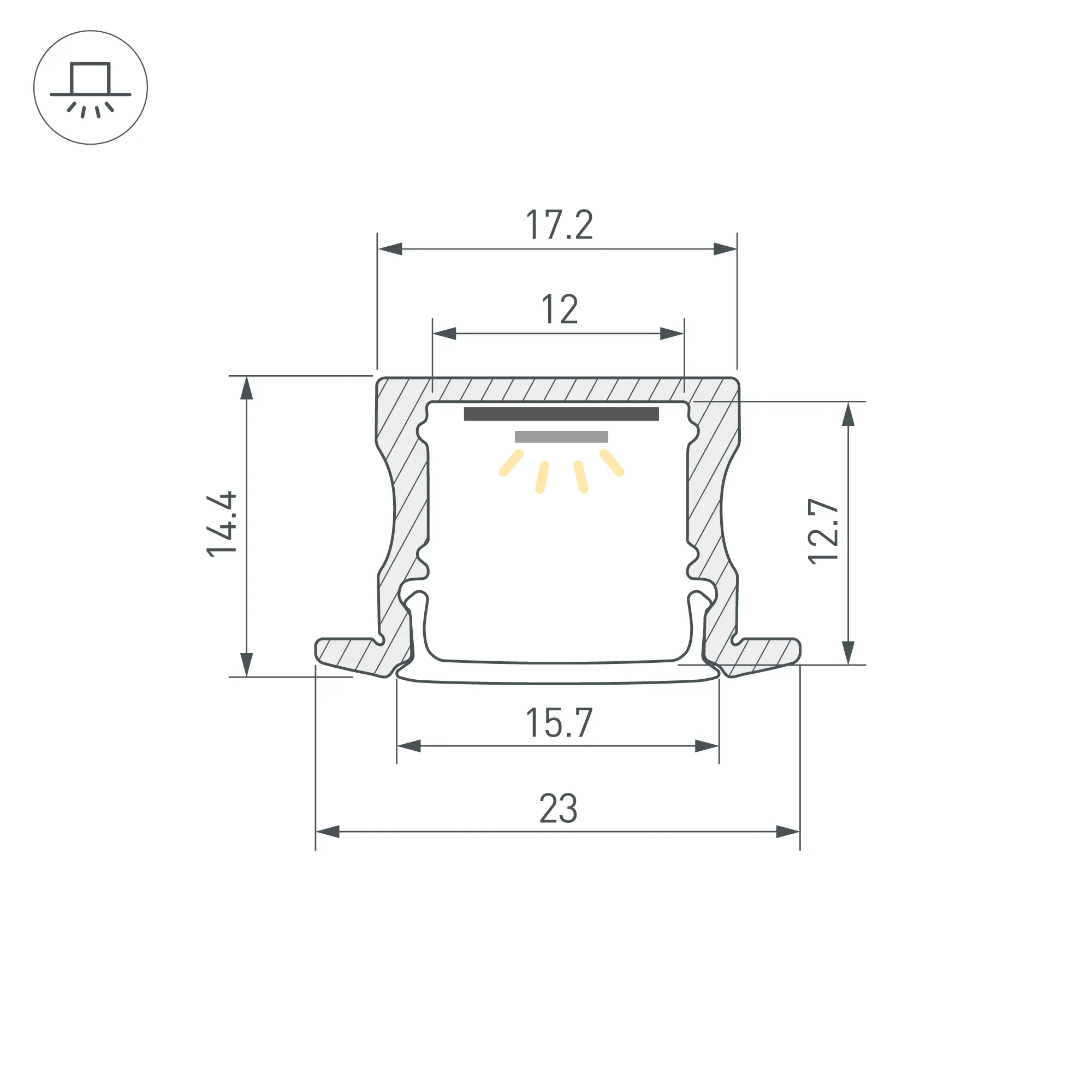 Алюминиевый анодированный встраиваемый профиль для светодиодных лент и линеек. Цвет - золотой. Габаритные размеры (L×W×H): 2000x23x14,4 мм. Паз для установки 17 мм. Ширина площадки для ленты 12 мм. Экраны, заглушки и другие аксессуары приобретаются отдельно. Цена за 1 метр.