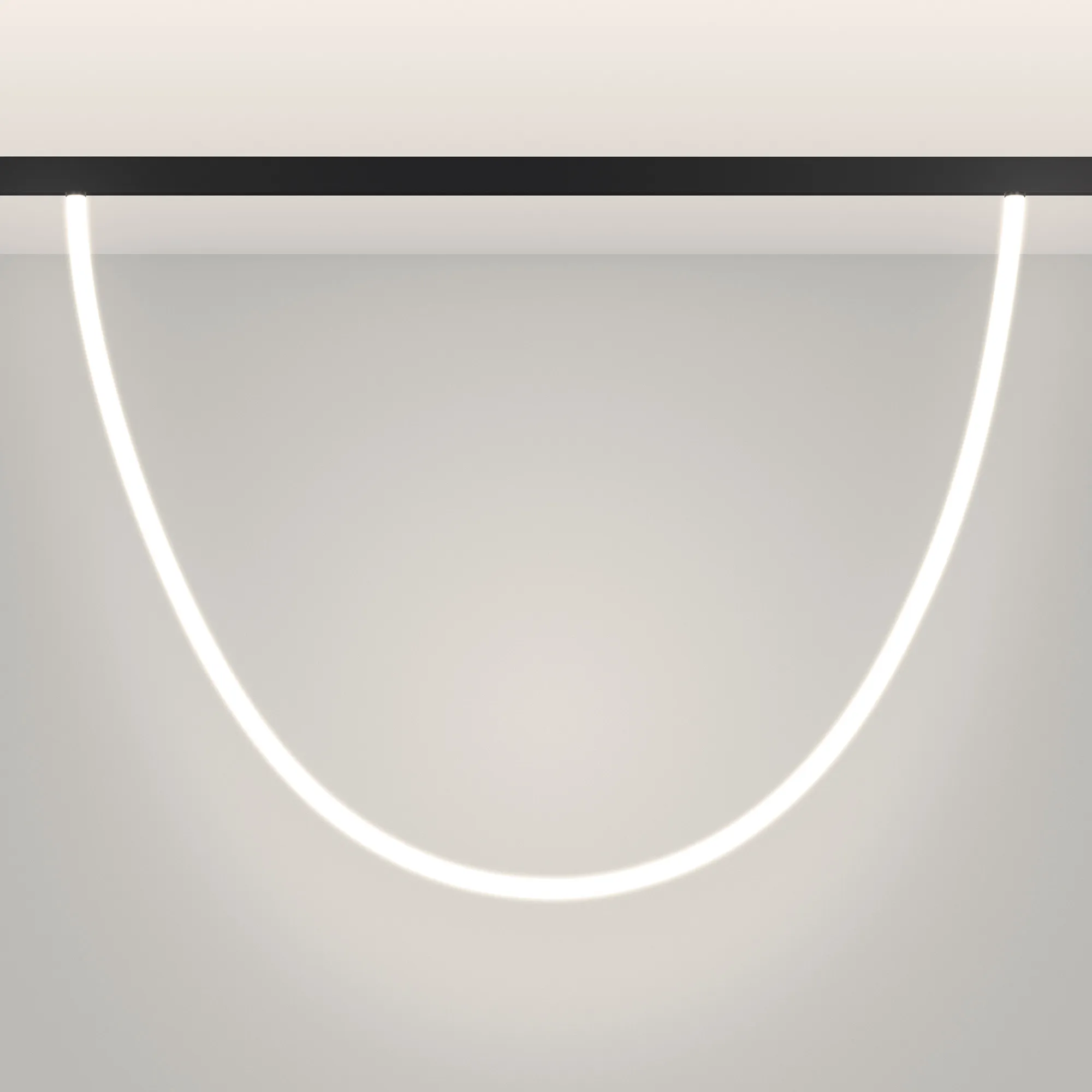 Светильник гибкий для магнитных треков серии ORIENT с управлением DALI. Мощность 35 Вт, св. поток 2275 лм, 65 лм/Вт, дневной 4000 K, CRI>90, угол 360°, напряжение питания 48 В. Матовый белый фигурный корпус из силикона с черными креплениями. Размер: диаметр 25 мм, длина 2500 мм. Монтаж на магнитный трек ORIENT. Адаптеры в комплекте.