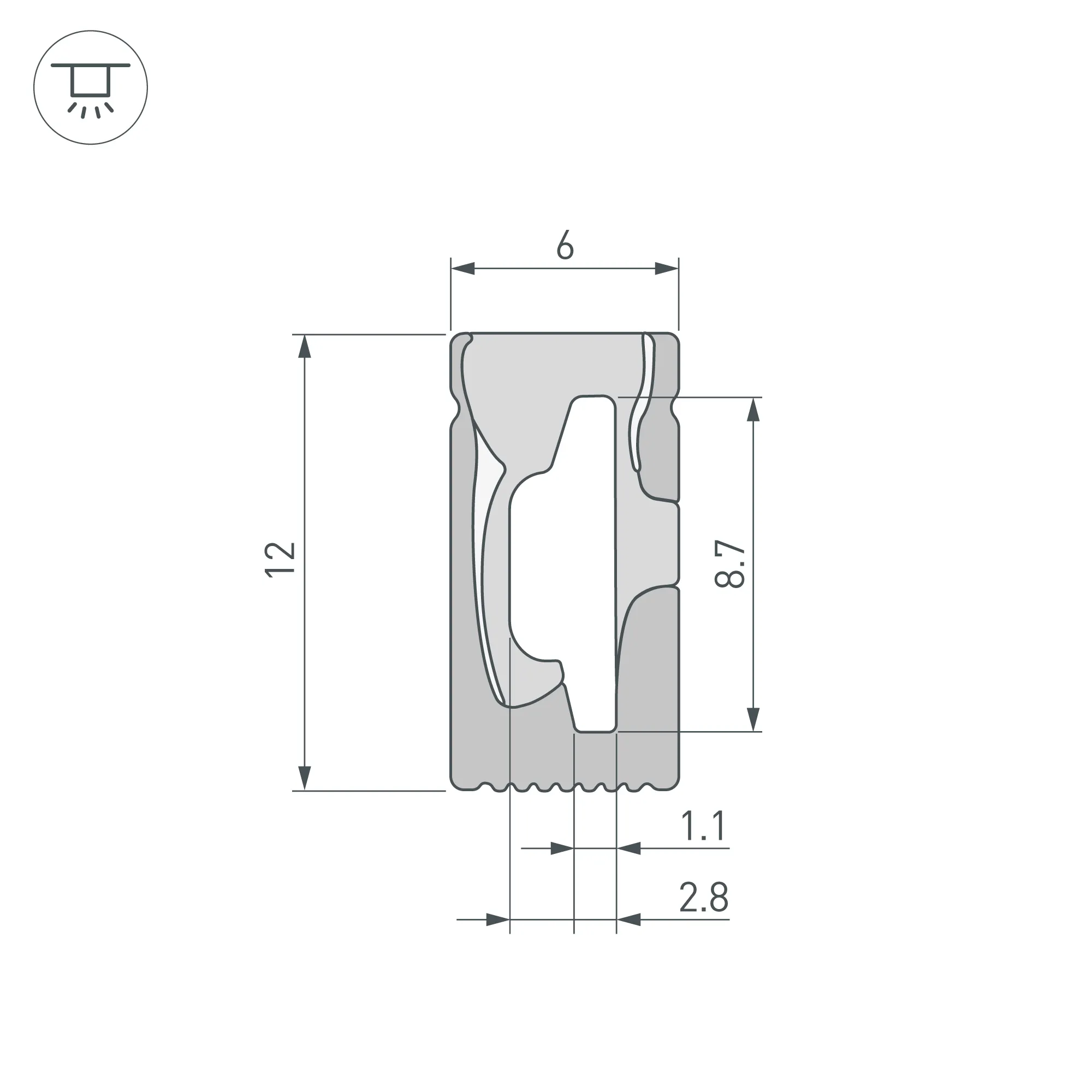 Цельнолитой силиконовый гибкий профиль, верхняя часть - белая матовая, остальные стороны - черные матовые. Габаритные размеры 5000×6×12 мм. Горизонтальный изгиб SIDE, минимальный радиус изгиба 30 мм. Для установки во влажных помещениях необходима герметизация при помощи двухкомпонентного эпоксидного герметика. Класс пылевлагозащиты – IP65 (при соблюдении технологии герметизации). Для лент шириной от 6 до 8 мм, высотой до 2,9 мм и мощностью до 10 Вт/м. При подборе ленты необходимо учитывать, что втяжка лент COB, герметичных лент и лент с наличием силиконового слоя может быть затруднена. Угол излучения 110°. Поставляется в катушках по 5 м. Цена за 1 м.