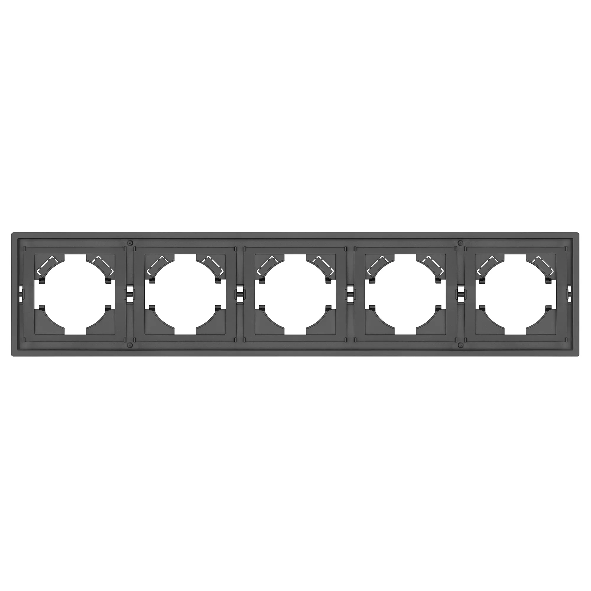 Рамка пластиковая на 5 постов, под встраиваемый механизм. Цвет - матовый графитовый, с Soft-Touch покрытием. Уровень герметичности IP20. Ориентация монтажа горизонтальная.